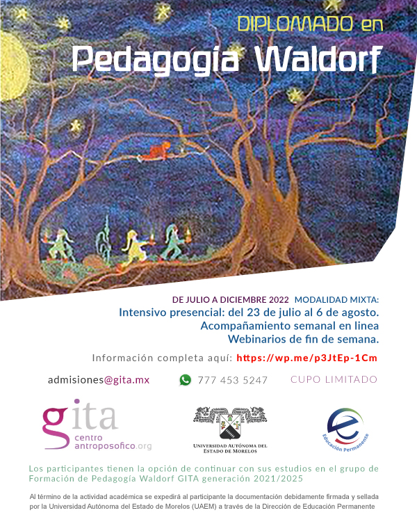 Al finalizar podrás obtener diploma con validez curricular por la Universidad Autónoma del Estado de Morelos y tendrás la opción de continuar con tus estudios en el grupo de Formación Waldorf generación 2022/2025 con la posibilidad de poder obtener certificación como docente Waldorf. La información sobre el programa completo de Formación Waldorf aquí >>